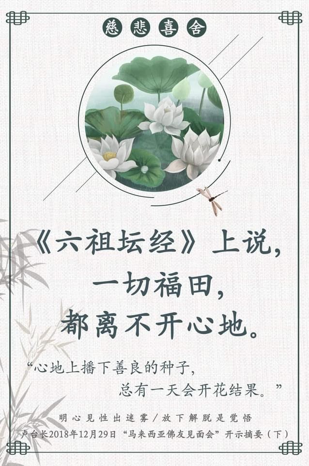 “去来自由,无滞无碍,应用随作,应语随答,普见化身,不离自性,即得自在神通游戏三昧,是名见性”,这句话是《六祖坛经》中的,讲的是一颗心。心中要有佛,心中有佛的人,心可以自由自在。因为不伤害别人,你才能自由自在,就像驾着车在马路上,如果你不伤害其他汽车和行人,当然就是自由自在地在开车。“无滞无碍”,没有任何可以阻挡你的。一个有正能量心态的人,他“应用随作”,就是他应起来、用起来的时候,随心所作。“应语随答”,应别人的语言就可以答辩,跟别人回答。“普见化身”,心到处都是菩萨的化身。“不离自性,即得自在神通”,只要拥有了内心的佛性、本性,就拥有了自在神通,就是自由。一个有良心的人,到哪里都不会受到别人的攻击;一个拥有智慧的人,到哪里都自由自在。“游戏三昧”,大家都知道“游戏神通佛”,游戏,虚实相半,就是度一个人的时候要虚实相半。有时候,用一句幽默的话去启发他,就像济公活佛在人间普度众生的时候,他内心平静,排除杂念,又用“游戏人间”的态度对待一切苦难众生,因为他把这个世界看成虚幻的,只是在人间走一遭,只是在人间看破了红尘,知道这是一个虚幻的世界,“三昧”就代表着他这种智慧的心态。